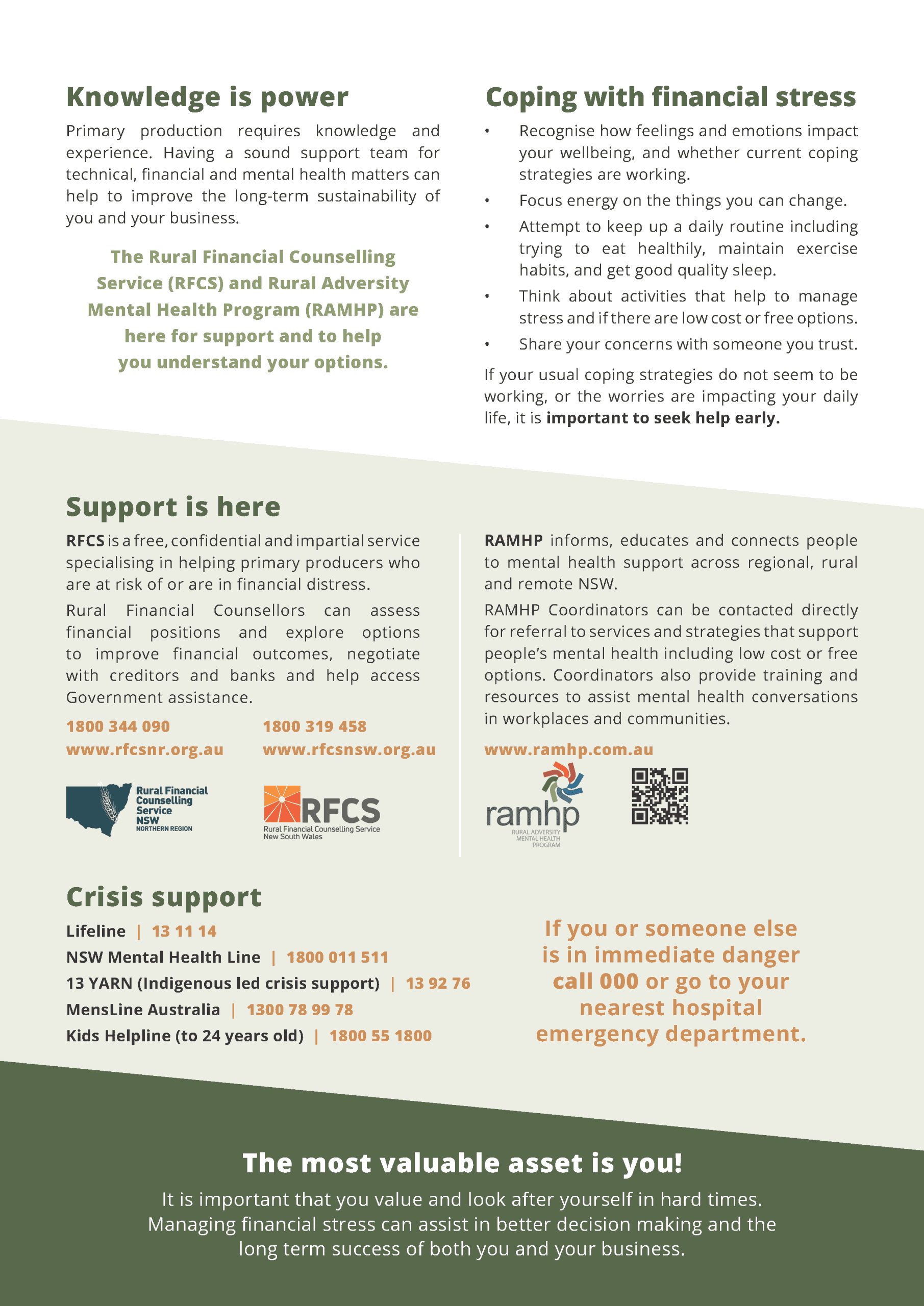 This year, Rural Financial Counselling Service NSW Northern Region (RFCSNR) has partnered with the Rural Adversity Mental Health Program (RAMHP) to launch a new fact sheet, The Real Cost of Financial Stress. It highlights how financial pressure and mental health challenges are closely linked, especially for farmers and small business owners.